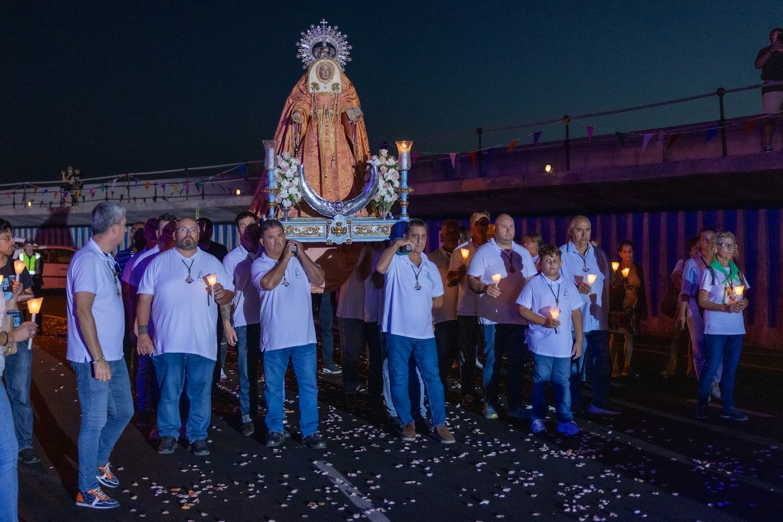 Posteriormente, los porteadores condujeron la imagen hasta el muelle, donde fue embarcada para iniciar la tradicional procesión marítima rumbo de regreso a la Playa de La Enramada. Numerosas embarcaciones acompañaron a la Virgen en su travesía, que fue despedida con un espectáculo de fuegos artificiales al cruzar la enfilación de los faros de entrada y salida del puerto.